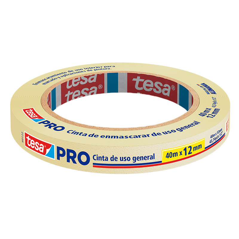 Cinta de enmascarar ferretera de uso general, grado economico. Adecuada adherencia en la mayoría de las superficies. Buena protección de la superficie. Usar en aplicaciones inferiores a 24 horas. Es una cinta multipropósito de papel crepado apropiada para usos generales de atar, sostenimiento, identificación, sellado y para la protección de superficies. Medidas 40 metros de largo x 12 milímetros de ancho. Referencia 60187-00000-00 de Tesa.
