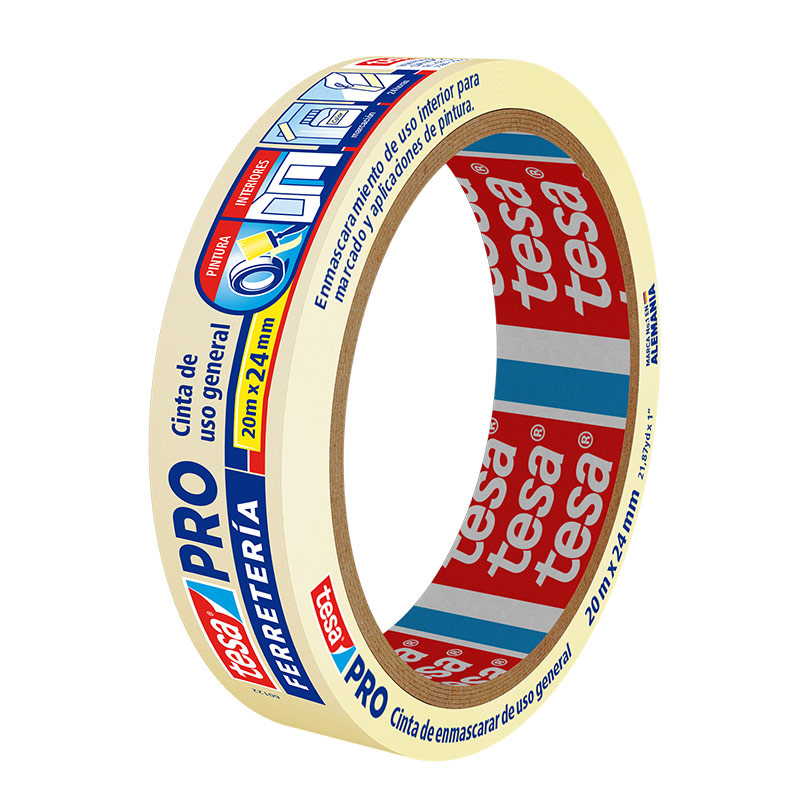 Cinta de enmascarar ferretera de uso general, grado economico. Adecuada adherencia en la mayoría de las superficies. Buena protección de la superficie. Usar en aplicaciones inferiores a 24 horas. Es una cinta multipropósito de papel crepado apropiada para usos generales de atar, sostenimiento, identificación, sellado y para la protección de superficies. Medidas 20 metros de largo x 24 milímetros de ancho. Referencia 60187-00013-00 de Tesa.