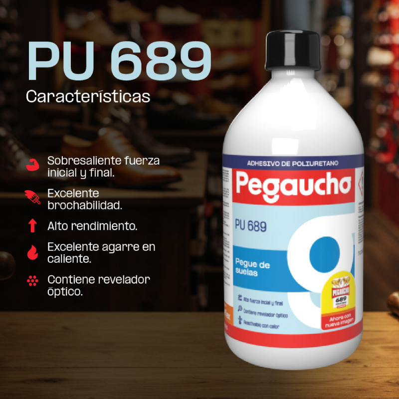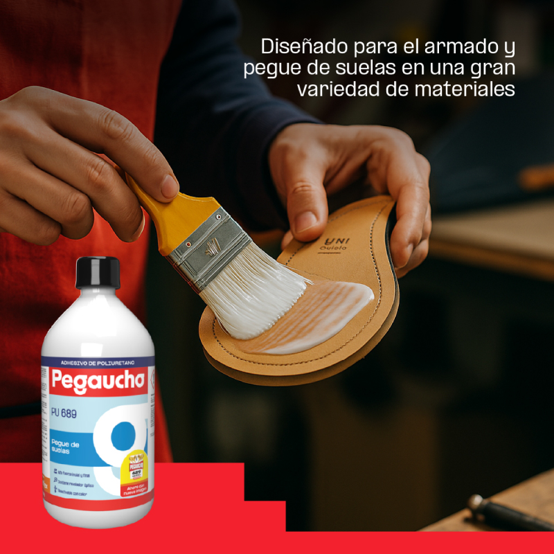 Para pegue de suelas de PVC, PVC expanso, poliuretano, crupón, TR, TR expanso, neolite, EVA, caucho vulcanizado, crepé a cueros semigrasos, secos, lonas, piezas metálicas, telas vinílicas o de poliuretano.