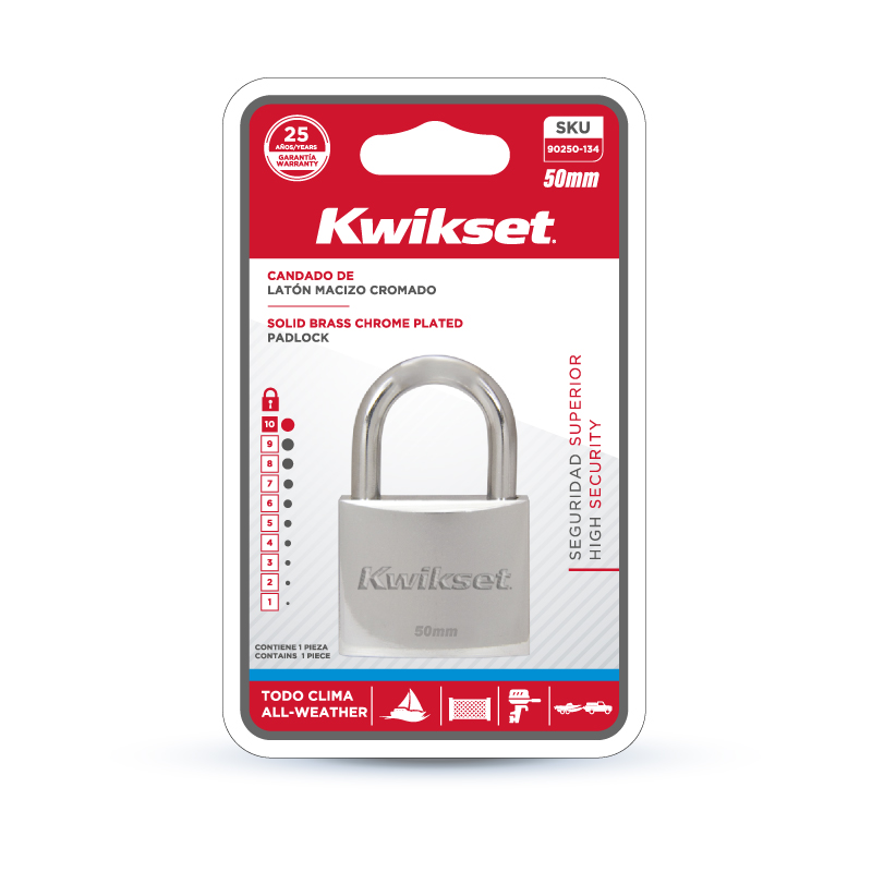 "Los candados de latón cromados Kwikset® ofrecen protección adicional contra la corrosión cerca de entornos costeros. La línea de candados Marinos cuentan con un cromado exterior que los convierte en una opción ideal para asegurar la propiedad en aplicaciones al aire libre además, son construidos con cuerpo y pasadoresde latón, resortes de acero inoxidable y un grillete de acero endurecido de doble bloqueo."