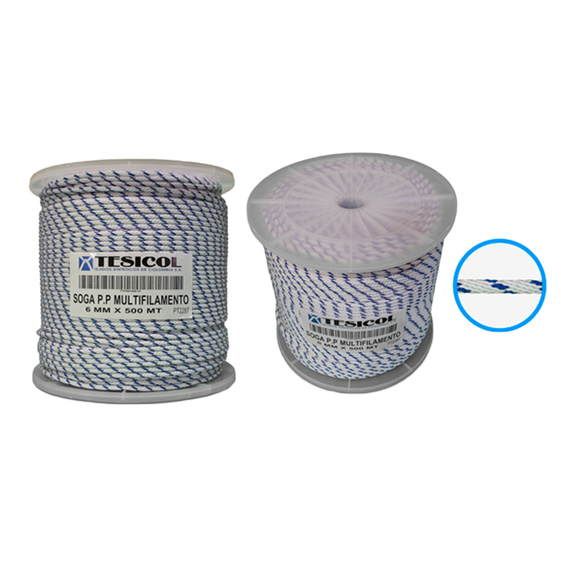 Soga Multifilamento De Polipropileno Blanca-Azul 1/4" 6Mm X 500 Mts PT2287