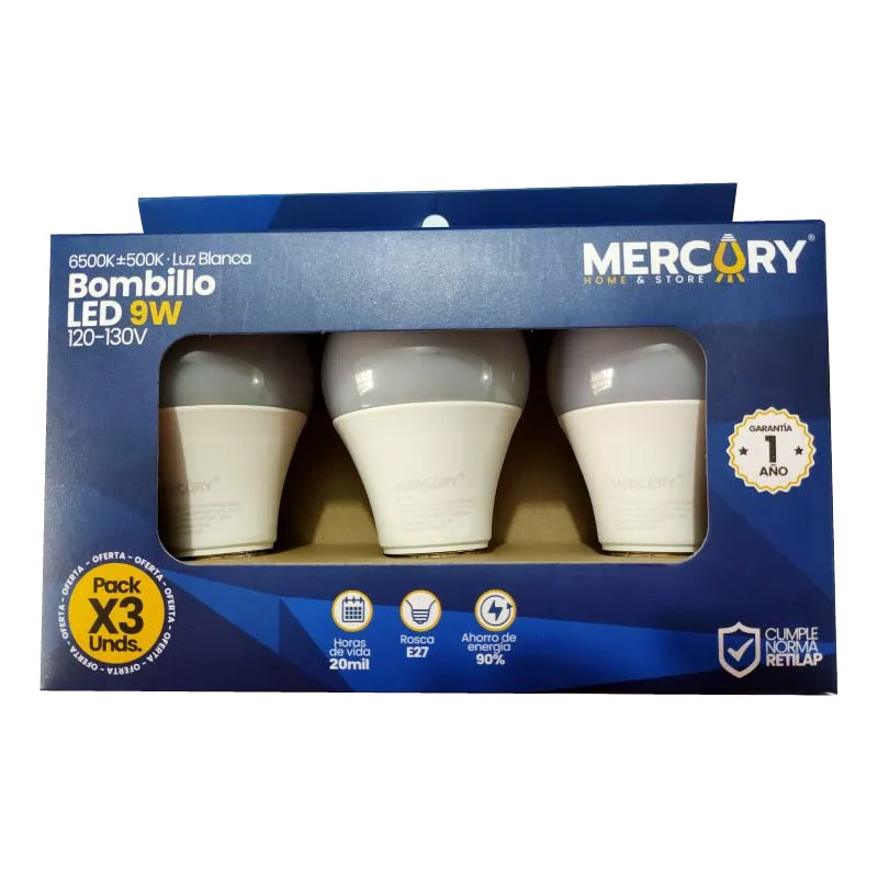 Vatios: 9W Voltaje: 120-130V Color: Blanco 6500K Presentacion: Blizter X 3 bombillos