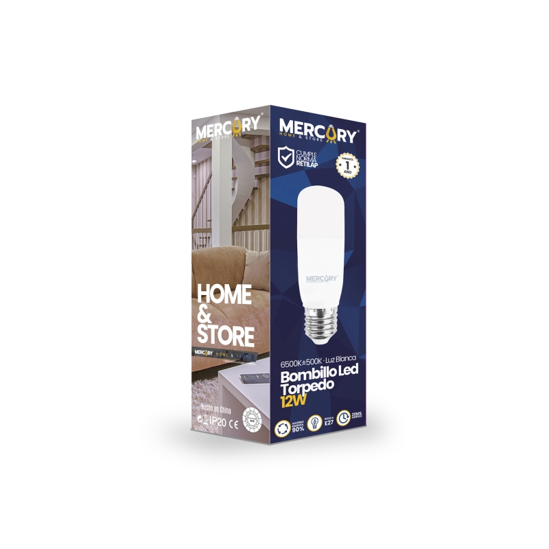 Bombillo LED torpedo. Potencia: 12W. Color de la LUZ: Luz Blanca 6500K. Voltaje: 100-240V. Base: E27. Temperatura de operación: -20 a 50°C