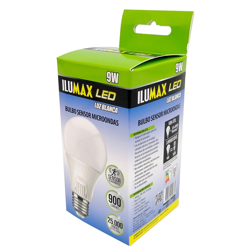 Bulbo Led 9w 900 Lm Con Sensor De Movimiento Microondas. Ángulo Del Sensor: 124°. Alcance Del Sensor Diámetro De Detección 5 Metros. Voltaje: 100-240v. Tiempo Encendido 30 Seg.