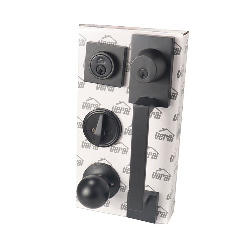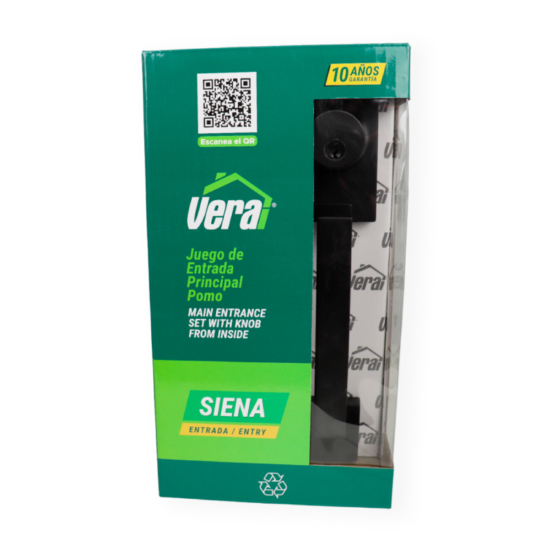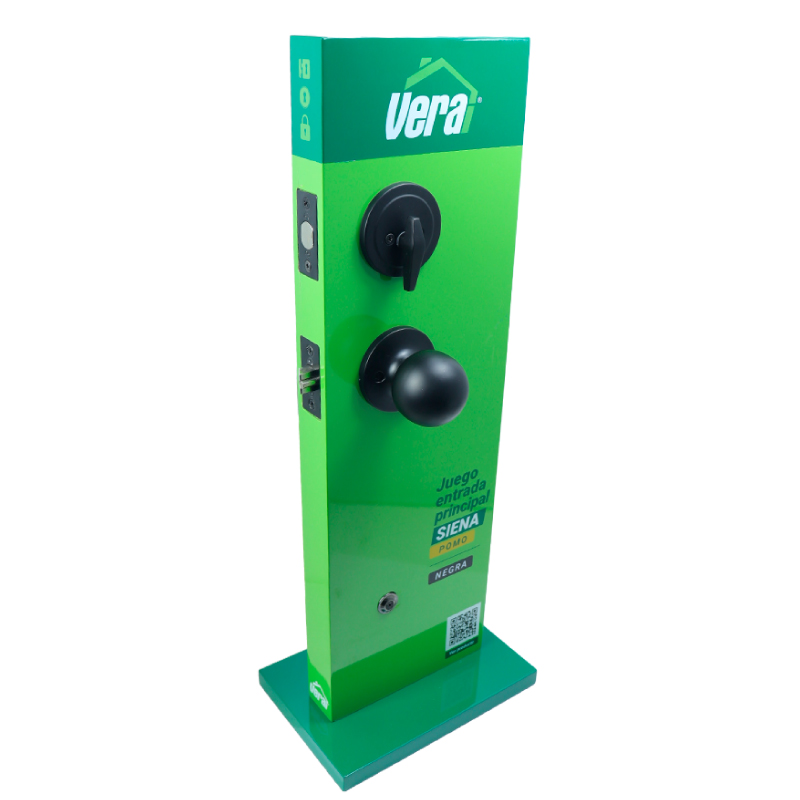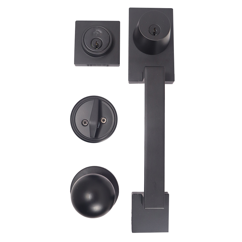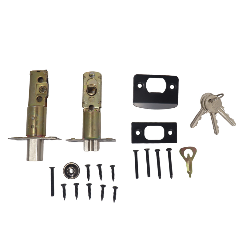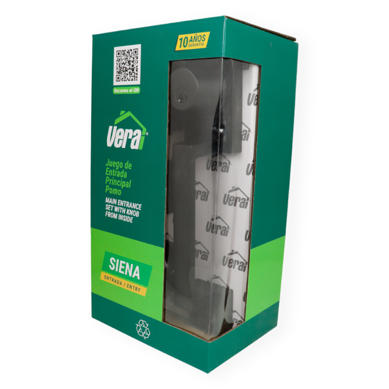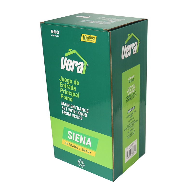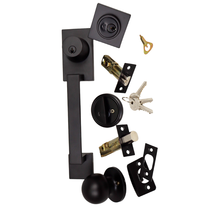 Juego de entrada principal con acabado pintura negra para bloquéo instantáneo de puertas. Apertura desde el exterior únicamente con llave. Función de misma llave en la cerradura y el cerrojo auxiliar. Se acciona desde el interior con pomo en la cerradura y con perilla en el cerrojo. Cuerpo fabricado en aleación de zinc de alta resistencia, mecanismo interior y llaves en latón. Distancia de instalación al canto de la puerta (backset) ajustable de 60 a 70mm. Para instalación en puertas con espesores entre los 40 y 55mm.