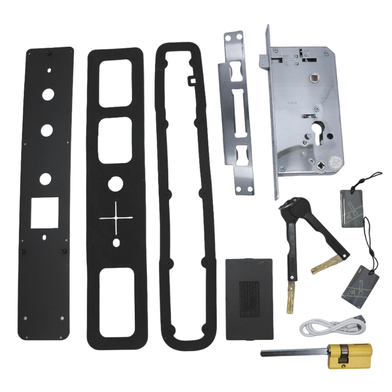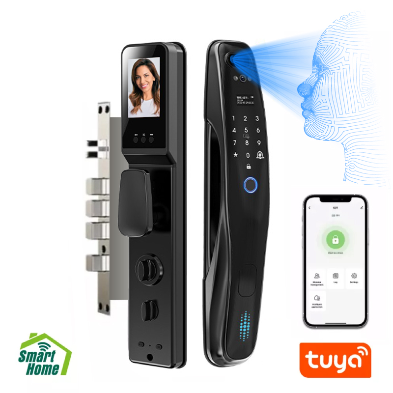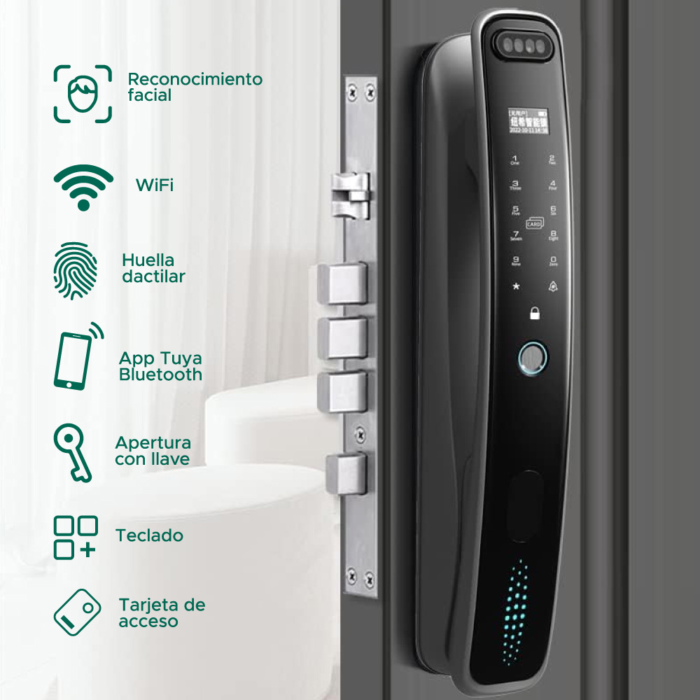 6 formas de desbloquear: Acceso por WiFi Aplicación Tuya, Tarjeta, Huella dactilar, Contraseña, reconocimiento facial, llaves Y con cámara -Fuerte y seguro Panel de cerradura de aleación de aluminio, Anticorrosivo - Puerto USB tipo c interfaz de fuente de alimentación externa, en caso de que el poder está muerto - con 4200mAh batería de litio recargable, registra hasta 100 huellas, 100 contraseñas, 100 tarjetas. Cuerpo de incrustar de 4 bulones para mayor seguridad. La batería tiene una duración de hasta 2000 ciclos de desbloqueo. Sin embargo, el consumo puede variar según el uso del detector de movimiento, ya que una detección constante incrementa el desgaste y reduce la carga de la bateria