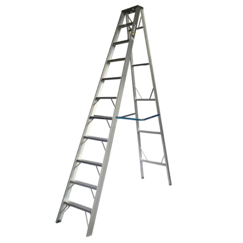Escalera tijera en aluminio, tipo I uso industrial, 11 pasos, capacidad de carga 137 kg, se fabrican bajo la norma ANSI 14.2. Aluminio estructural de alta resistencia.