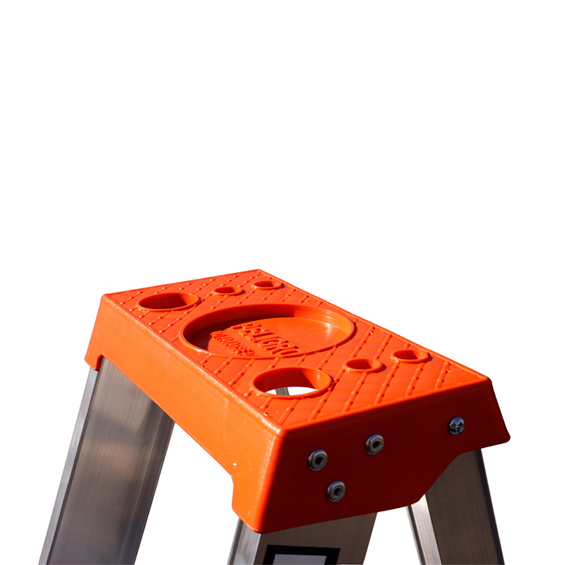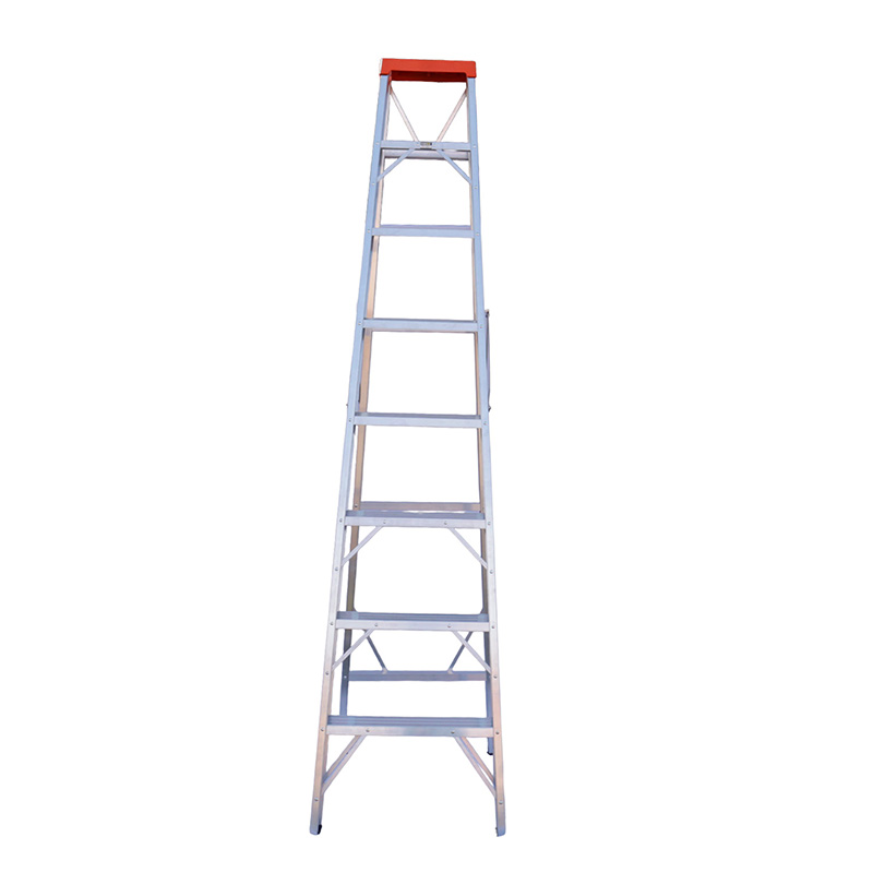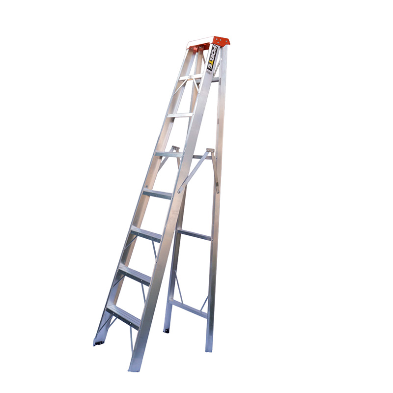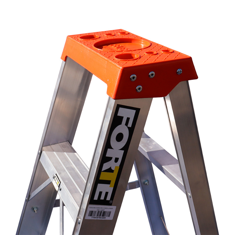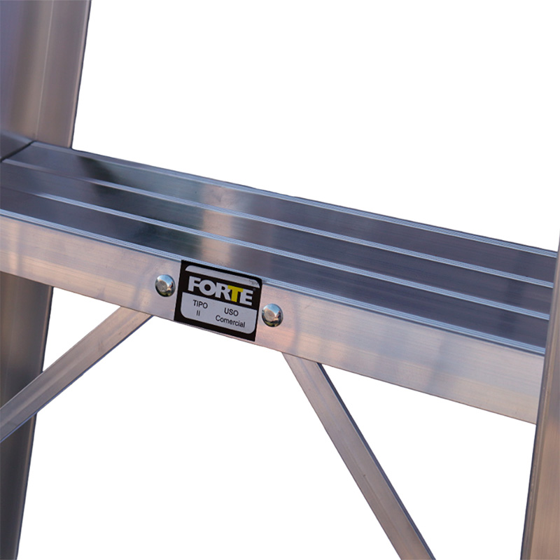 Escalera tijera en aluminio, tipo II uso comercial, 8 pasos, meseta plastica, capacidad de carga 102 kg, se fabrican bajo la norma ANSI 14.2. Aluminio estructural de alta resistencia.