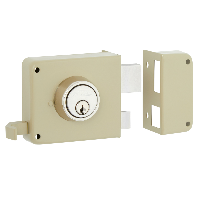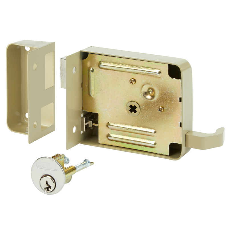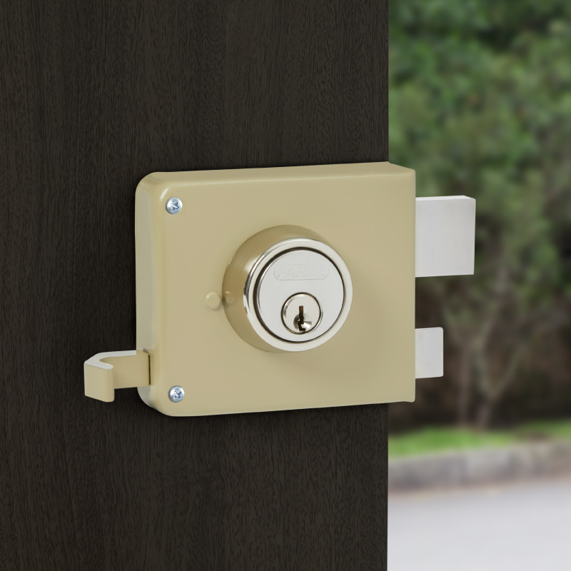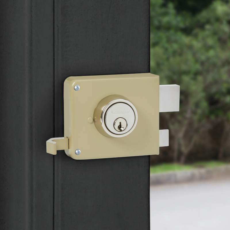 Cerradura de Sobreponer Pasador Cuadrado Lado Derecho Instala-fácil, 25 años de garantía. Cuerpo en Acero. Para Instalar o soldar en Metal o Instalar en Madera. Cuenta con 5 Pernos de Seguridad, Pasador de Seguridad accionable en 3 Pasos, Manija reversible con tornillo, a diferencia de otros modelos esta cerradura Incluye 3 llaves. Centro a puerta 50 mm, Cilindro Suelto Cubierto que Permite Trabajo en Puertas de Diferentes Espesores (35 - 60mm), Color Beige. Como Identificar el lado de la puerta: deberás Pararte Frente al Exterior, Si las bisagras están en el lado derecho, la puerta es derecha y si las bisagras están instaladas del lado izquierdo, la puerta es izquierda.