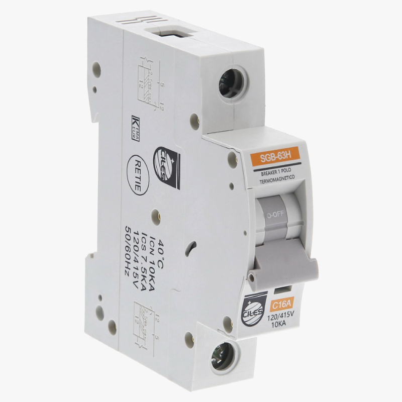 Breaker termomagnético Riel DIN para protección y distrib. de circuitos eléctricos en baja tensión contra sobrecargas y cortocircuitos, eficiente por su doble protección térmica y magnética. Montaje en riel omega, Material Poliamida termoplástico, Color Gris claro, Contacto cobre estañado, Indice de proteccion IP20, Indicador estado de operación on/off, Polos 1-2 y 3, Terminal de conexíon con Borne tornillo prisionero, Stma de conexion barra tipo peine, Frecuencia de oper AC 60 Hz, Curva disparo Tipo C, Rango de temp -5°Ca40°C, In Capacidad cte nominal (Amperios) 16/20/32/40/50/63, Icc Corriente de corto circuito (KA) 10KA Ue= Tensión Nom (V) 120/240/415,Ui= Tensión impulso (KV) 4, Clase de