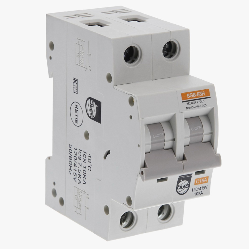 Breaker termomagnético Riel DIN para protección y distrib. de circuitos eléctricos en baja tensión contra sobrecargas y cortocircuitos, eficiente por su doble protección térmica y magnética. Montaje en riel omega, Material Poliamida termoplástico, Color Gris claro, Contacto cobre estañado, Indice de proteccion IP20, Indicador estado de operación on/off, Polos 1-2 y 3, Terminal de conexíon con Borne tornillo prisionero, Stma de conexion barra tipo peine, Frecuencia de oper AC 60 Hz, Curva disparo Tipo C, Rango de temp -5°Ca40°C, In Capacidad cte nominal (Amperios) 16/20/32/40/50/63, Icc Corriente de corto circuito (KA) 10KA Ue= Tensión Nom (V) 120/240/415,Ui= Tensión impulso (KV) 4, Clase de