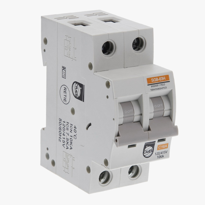 Breaker termomagnético Riel DIN para protección y distrib. de circuitos eléctricos en baja tensión contra sobrecargas y cortocircuitos, eficiente por su doble protección térmica y magnética. Montaje en riel omega, Material Poliamida termoplástico, Color Gris claro, Contacto cobre estañado, Indice de proteccion IP20, Indicador estado de operación on/off, Polos 1-2 y 3, Terminal de conexíon con Borne tornillo prisionero, Stma de conexion barra tipo peine, Frecuencia de oper AC 60 Hz, Curva disparo Tipo C, Rango de temp -5°Ca40°C, In Capacidad cte nominal (Amperios) 16/20/32/40/50/63, Icc Corriente de corto circuito (KA) 10KA Ue= Tensión Nom (V) 120/240/415,Ui= Tensión impulso (KV) 4, Clase de