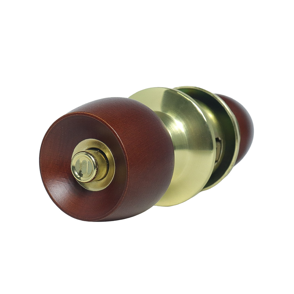 Cerradura Cilíndrica con Pomo de Madera Elegante y funcional, esta cerradura cilíndrica está diseñada para alcobas y baños, combinando la calidez del pomo de madera con la resistencia de sus piezas metálicas externas en acabado de latón pulido. Cuenta con un cilindro de latón (alcoba, entrada) para mayor seguridad y durabilidad. Su centro de instalación de 60mm (2-3/8") y roseta de 65mm permiten una fácil adaptación a puertas con un espesor de 35 a 50mm. Incluye 3 llaves de acero con acabado niquelado. Hasta 85000 mil ciclos, empaque caja
