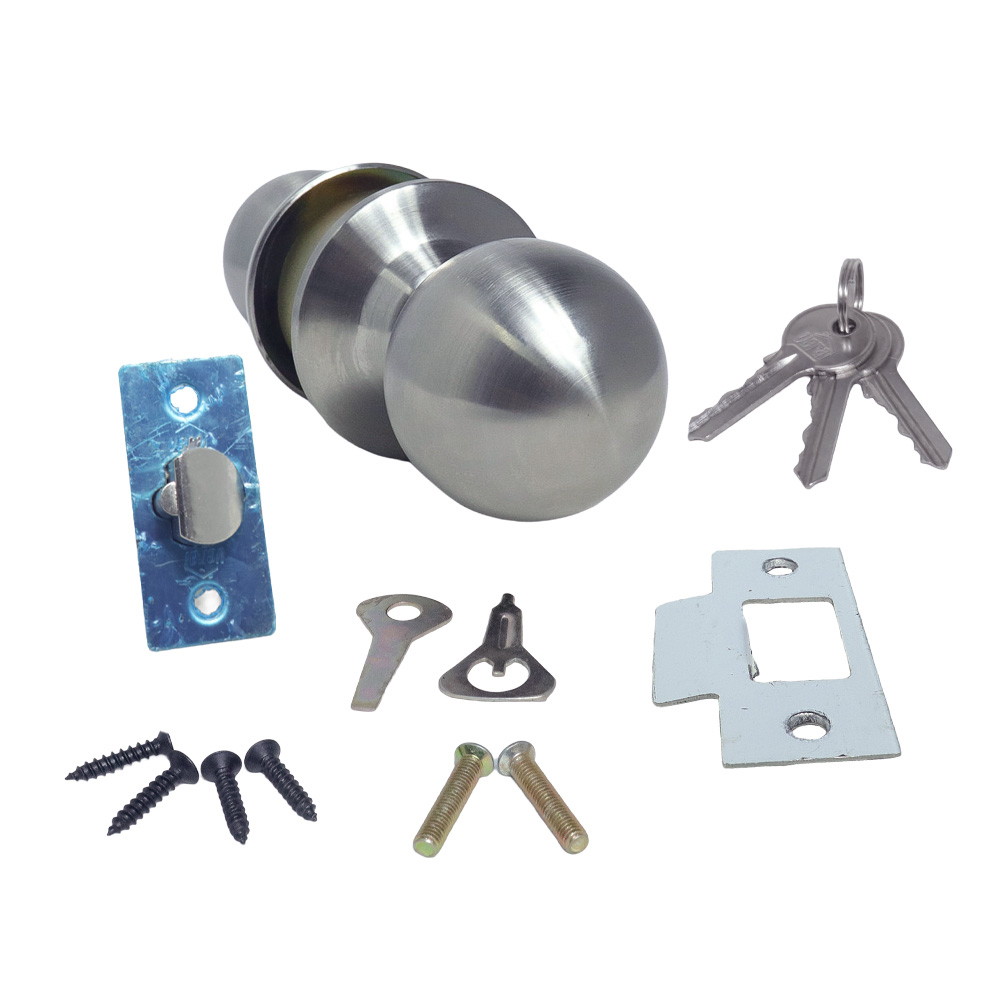 Cerradura Cilíndrica con Pomo acabado Acero Inoxidable Nuovo, Diseñada para ofrecer seguridad y estilo, esta cerradura cilíndrica cuenta con un resistente acabado en acero inoxidable que brinda durabilidad y resistencia a la corrosión. Su cilindro de zamak (Alcoba, entrada) garantiza un mecanismo confiable, mientras que su centro de instalación de 60mm (2-3/8") y roseta de 65mm permiten una fácil instalación en puertas de 35 a 50mm de espesor. Incluye 3 llaves de acero con acabado niquelado. Hasta 85000 mil ciclos, empaque caja