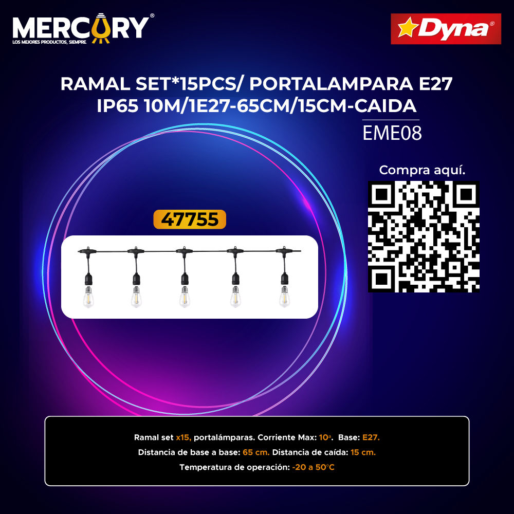 Ramal set Por 15 portalámparas. Corriente Max: 10 Amp. Base: E27. Distancia de base a base: 65 cm. Distancia de caída: 15 cm. Temperatura de operación: -20 a 50°C. *No viene con los bombillos.