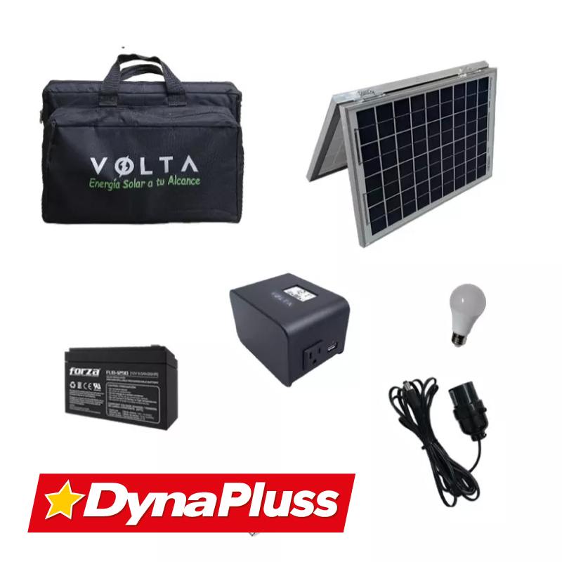Kit De Energía Solar Portátil De 100W/Día. Este Sistema De Energía Solar OFF GRID Te Brinda Un Respaldo En 110VAC Con Hasta 3 Horas De Autonomía. Es Ideal Para Conectar Dispositivos De Bajo Consumo Como Teléfonos Celulares, Tablets, Audífonos Inalámbricos, Dispositivos De Rastreo GPS, Mini Parlantes, Cámaras, Grabadoras Y Cualquier Otro Equipo Electrónico Con Puerto USB, Incluyendo Lámparas LED. Componentes del Kit VoltaBox 100W/día1 Módulo central Volta Box. 110v 200W con pantalla LCD y cable para batería. 1 Batería 12 V.DC 9Ah 1 Panel solar plegable 20W Portátil 1 extensión de 4m. para conexión del panel solar. 1 Fusible de repuesto 3 metros de cable para luminaria 1 bombillo LED 12V 1 G