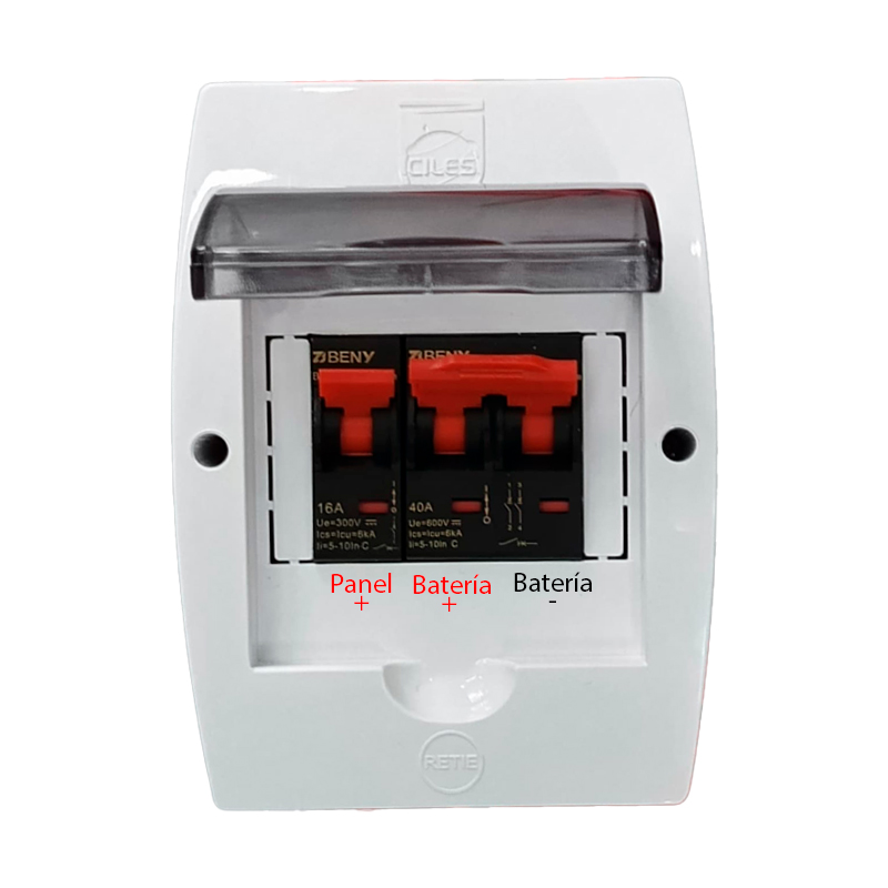 Componentes del kit 1 Panel solar 550W (230x115 cm)1 Inversor/cargador 1200W 24V 60 mppt 2 Batería Gel 12 V.dc 80Ah1 Tablero de protecciones 20-40Ah1 Kit de instalación 1 Guía para el usuario 1 Gabinete metálico para baterías