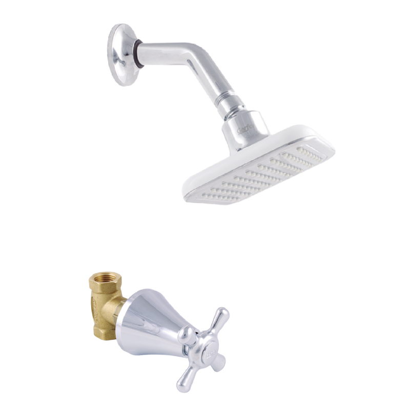 Conjunto registro ducha manija cruceta ANTIUS, incluye regadera Alma. Cuerpo en latón y sistema cierre cerámico, ideal para agua premezclada.