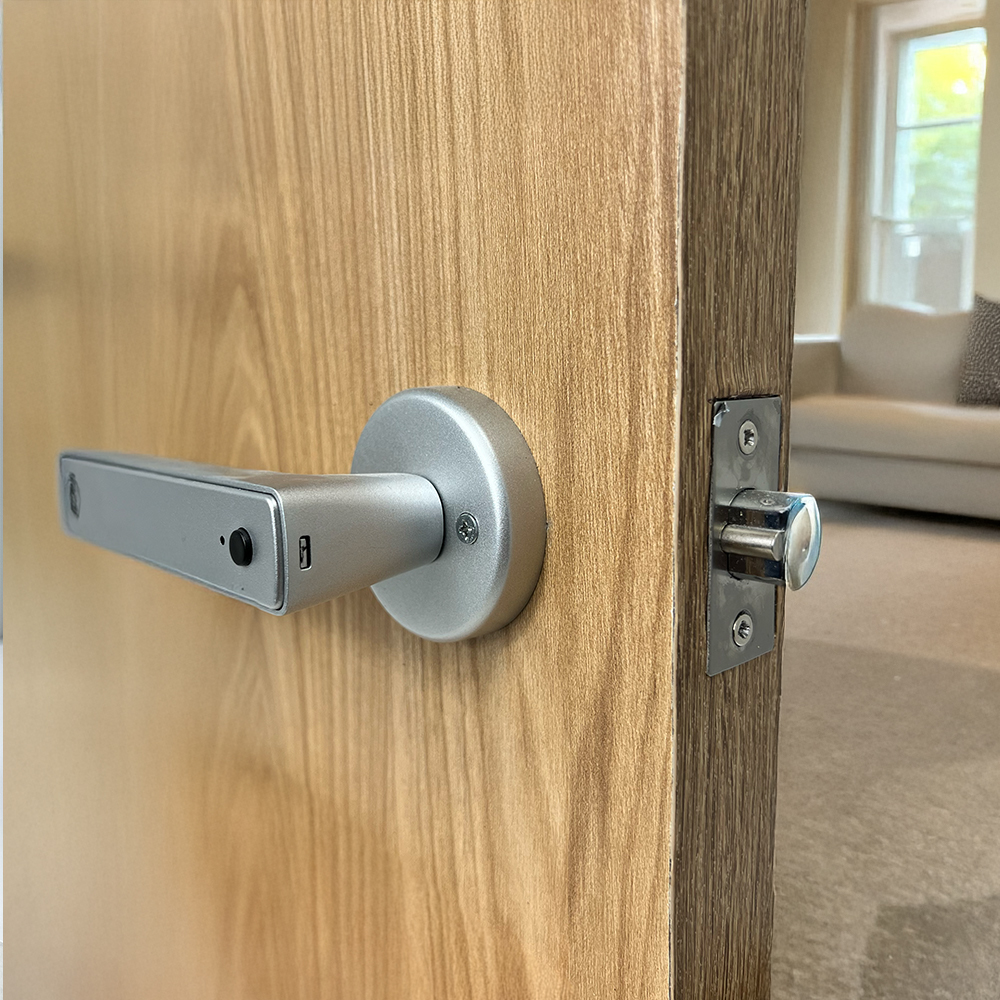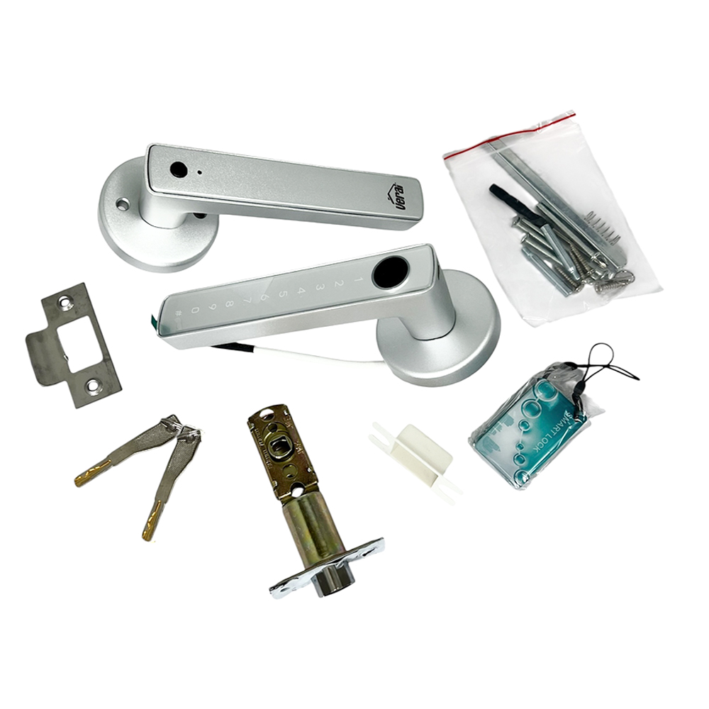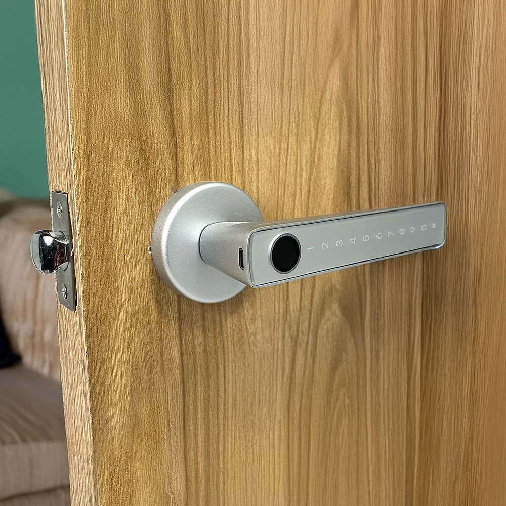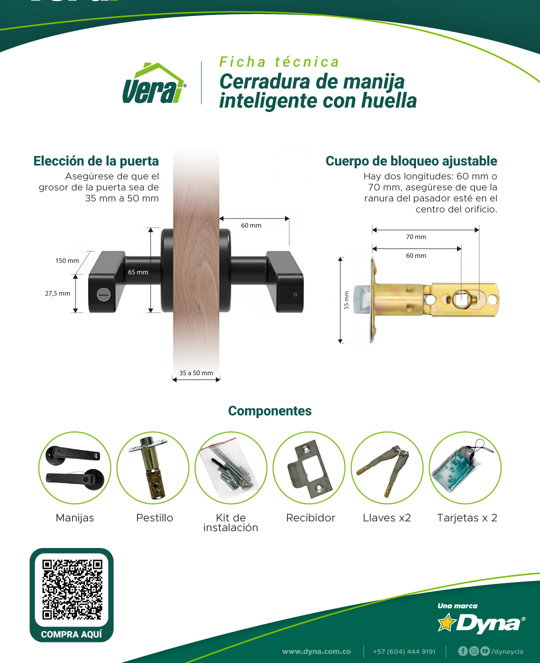 Cerradura inteligente fabricada en aleación de aluminio de alta resistencia con acabado en pintura plateada, diseñada para brindar seguridad y tecnología avanzada en accesos principales. Permite múltiples métodos de apertura: huella dactilar, códigos numéricos, llave de seguridad y control desde la app Tuya mediante conexión Bluetooth. Soporta hasta 100 huellas dactilares y 100 códigos de acceso, ideal para uso residencial o comercial. Cuenta con pestillo ajustable a centros de instalación de 60 y 70 mm, compatible con diferentes configuraciones de puerta. Funciona con 4 baterías AA. Dimensiones del producto: 155 x 65 mm. Diseño moderno, confiable y fácil de instalar.