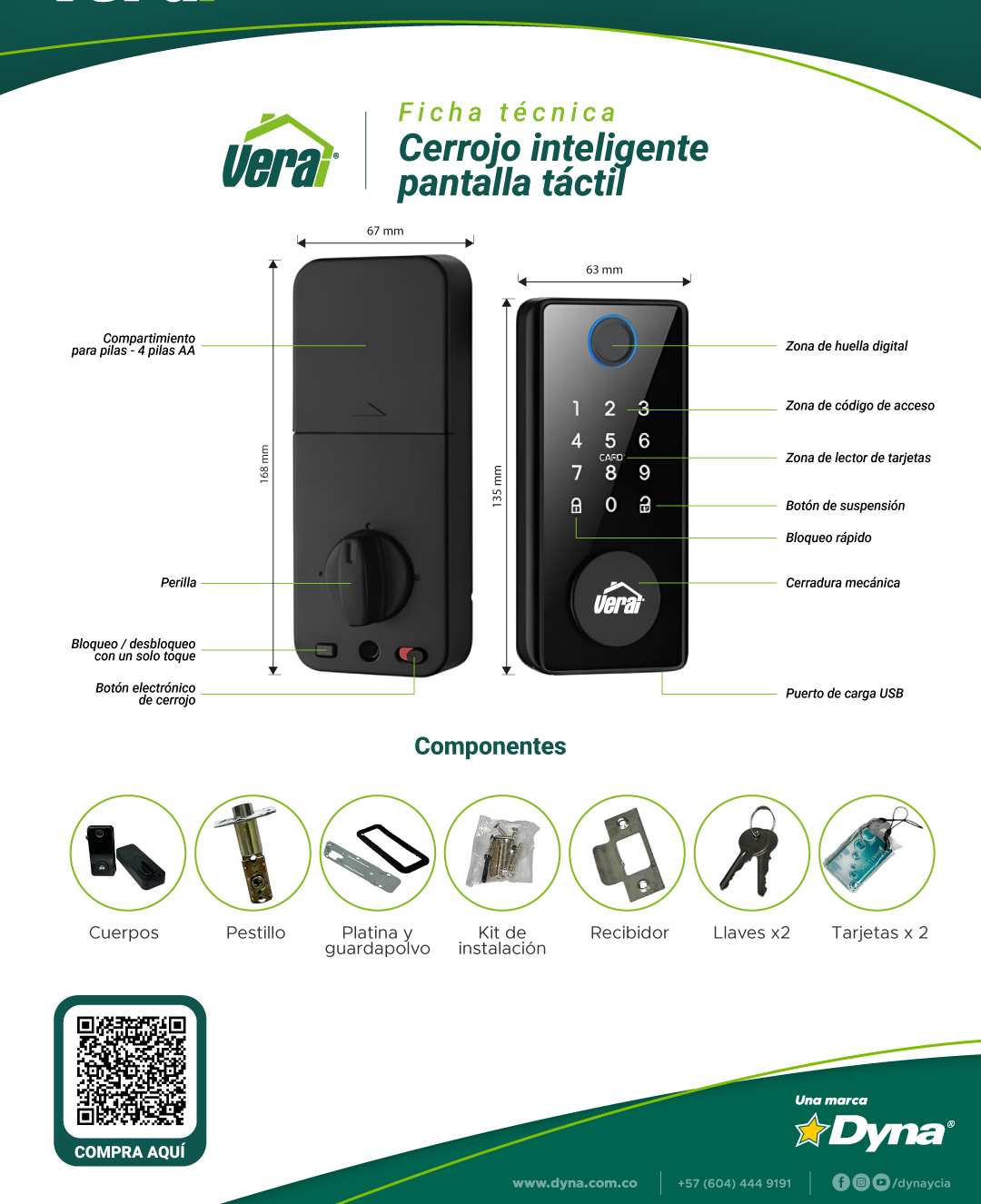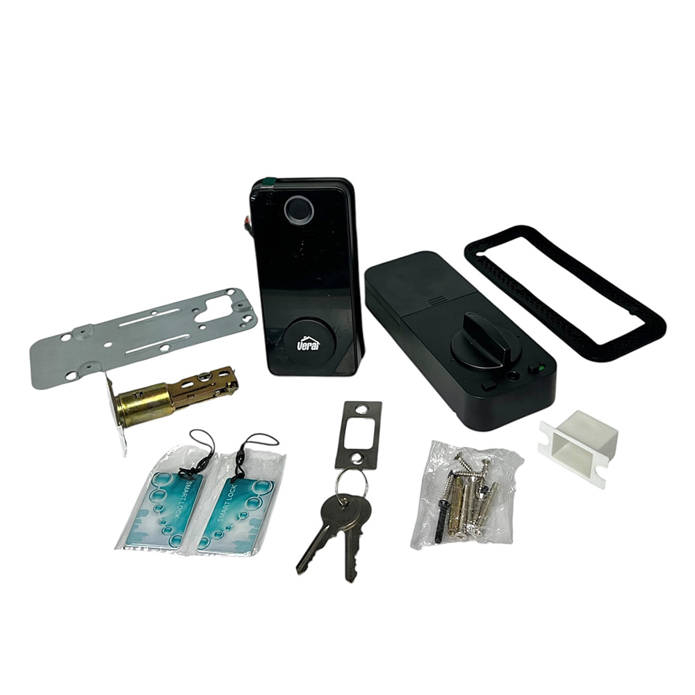 Cerrojo inteligente fabricado en aleación de aluminio y ABS de alta resistencia, con acabado negro moderno y elegante. Ofrece múltiples métodos de apertura: huella dactilar, código numérico, tarjeta, llave de seguridad y control desde la app Tuya mediante conexión Bluetooth. Tiene capacidad para almacenar hasta 100 huellas y 100 códigos, lo que lo hace ideal para uso residencial o comercial. Incorpora pestillo ajustable a centros de instalación de 60 y 70 mm, compatible con distintos tipos de puerta. Funciona con 4 baterías AA. Dimensiones del producto: frente 135 × 63 mm y parte posterior 168 × 67 mm. Diseño robusto, seguro y de fácil instalación.