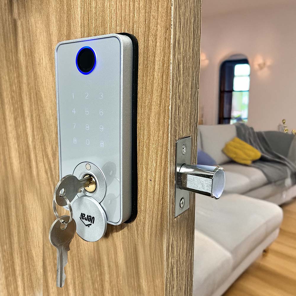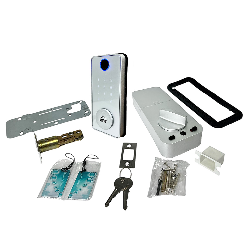 Cerrojo Inteligente Fabricado en Aleacion de Aluminio y ABS, Acabado Plateado, Pestillo Ajustable a Centro de instalacion de 60 y 70mm, Sistemas de apertura a traves de Codigo, Tarjeta, Huella, App y Llave de Seguridad, Capacidad de 100 codigos y huellas, Cuenta con conexion via Bluetooth para la APP Tuya, para conectarse al Wifi se requiere Gateway (Dispositivo de Enlace Adicional No Incluido) Alimentacion: 4 Baterias AAA