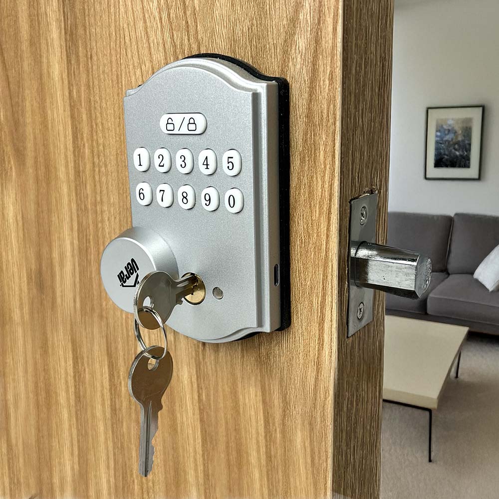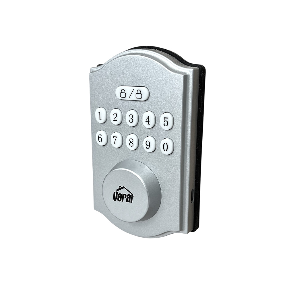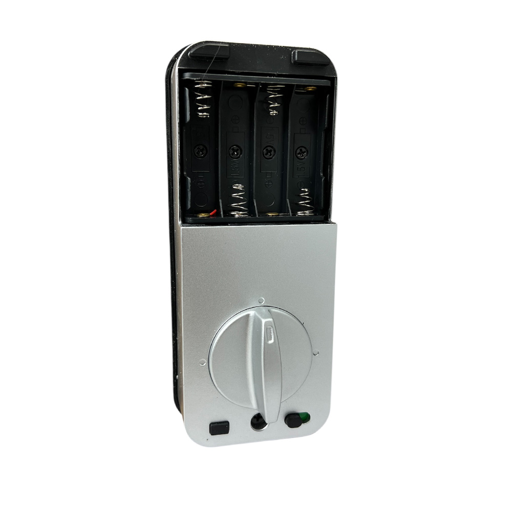 Cerrojo digital de diseño clásico, fabricado en aleación de aluminio y ABS de alta resistencia, con acabado silver elegante y duradero. Permite el acceso mediante contraseña a través de teclado digital, con capacidad para almacenar hasta 100 códigos, y apertura mediante llaves de seguridad para respaldo. No cuenta con conexión Bluetooth, lo que lo convierte en una solución autónoma. Incorpora pestillo ajustable a centros de 60 y 70 mm, compatible con diferentes tipos de puerta. Funciona con 4 baterías AA. Dimensiones del producto: frente 110 × 75 mm y parte posterior 168 × 67 mm. Ideal para aplicaciones residenciales o comerciales que requieren control de acceso sin conectividad.