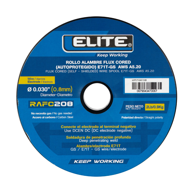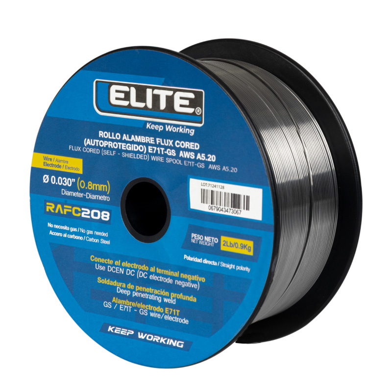 El rollo de soldadura autoprotegido (FCAW) E71T-GS es ideal para soldar acero al carbón. Viene en presentación de 2lb (0.9kg) y en diámetro 0.030” (0.8mm). Dentro de sus ventajas se encuentra que no requiere gas, se puede soldar en todas las posiciones y deja una leve escoria que se puede retirar fácilmente con grata circular o cepillo. Cuenta con una buena penetración en el material base y una buena presentación del cordón de soldadura.