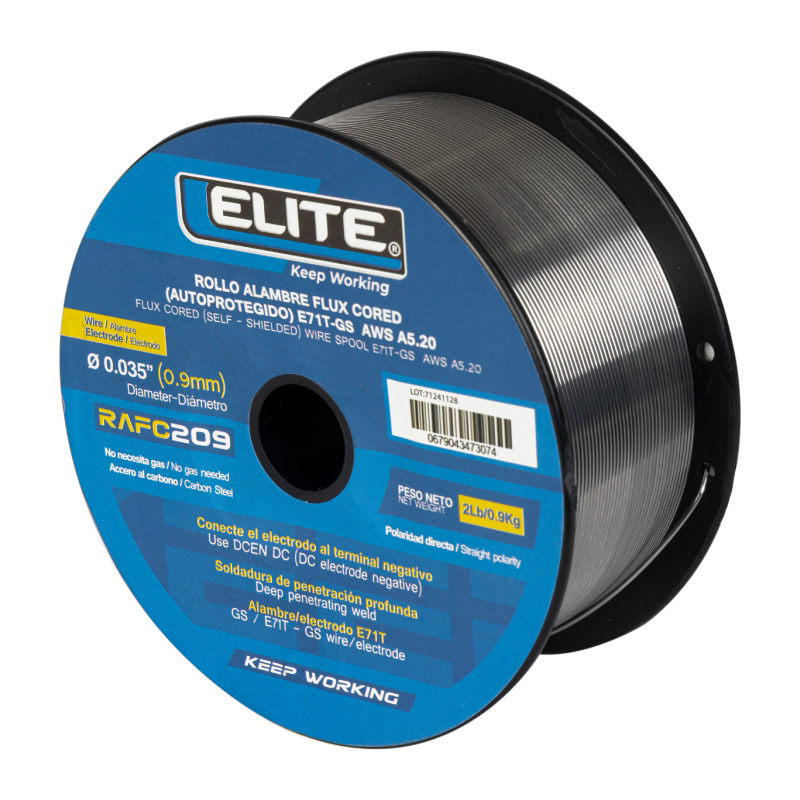El rollo de soldadura autoprotegido (FCAW) E71T-GS es ideal para soldar acero al carbón. Viene en presentación de 2lb (0.9kg) y en diámetro 0.035” (0.9mm). Dentro de sus ventajas se encuentra que no requiere gas, se puede soldar en todas las posiciones y deja una leve escoria que se puede retirar fácilmente con grata circular o cepillo. Cuenta con una buena penetración en el material base y una buena presentación del cordón de soldadura.