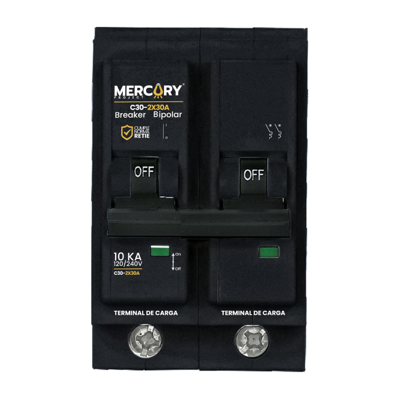 Interruptor termomagnético ideal para proteger contra sobrecargas y cortocircuitos. Tiene 2 Polos, capacidad de 30 amperios. Capacidad de corte de 10 kA. De uso exclusivo para cables de cobre_ Tipo de curva de disparo: C _Temperatura de operación: -20 a 50°C