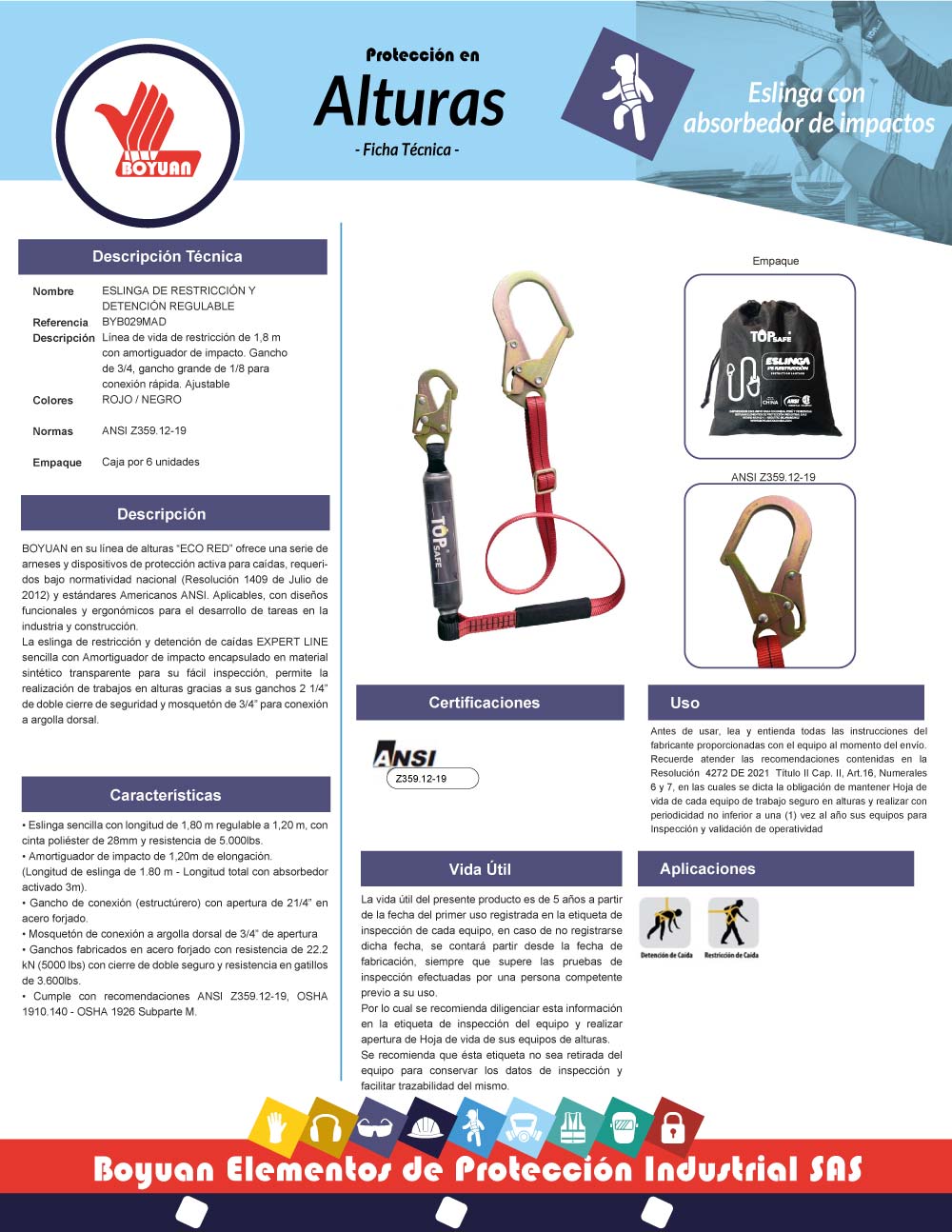 Eslinga sencilla con longitud de 1,80 m regulable a 1,20 m, con cinta poliéster de 28mm y resistencia de 5.000lbs.Amortiguador de impacto de 1,20m de elongación. (Longitud de eslinga de 1.80 m - Longitud total con absorbedor activado 3m).Gancho de conexión (estructúrero) con apertura de 21/4” en acero forjado. Mosquetón de conexión a argolla dorsal de 3/4” de apertura Ganchos fabricados en acero forjado con resistencia de 22.2 kN (5000 lbs) con cierre de doble seguro y resistencia en gatillos de 3.600lbs.