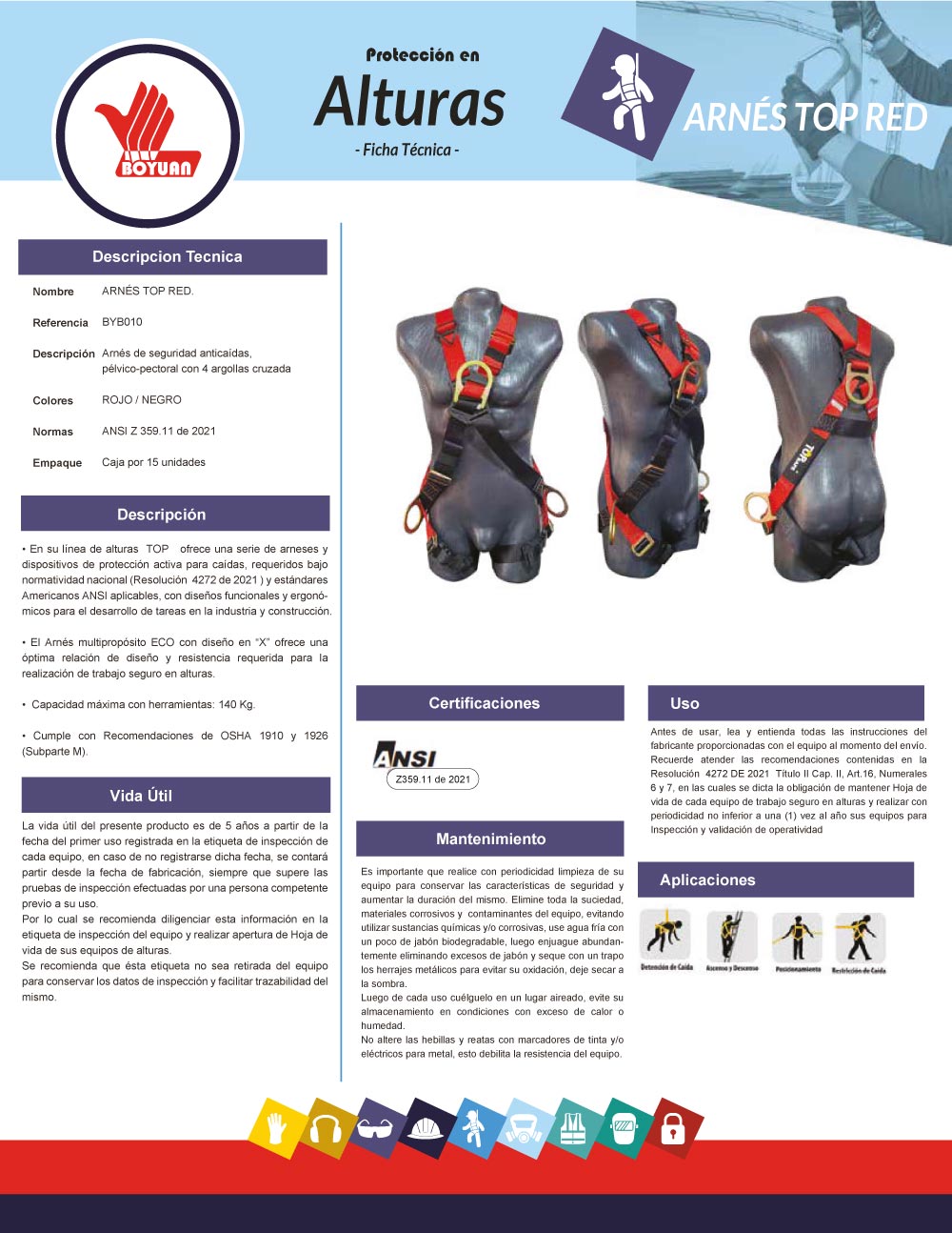 En su línea de alturas TOP ofrece una serie de arneses y dispositivos de protección activa para caídas, requeridos bajo normatividad nacional (Resolución 4272 de 2021 ) y estándares Americanos ANSI aplicables, con diseños funcionales y ergonómicospara el desarrollo de tareas en la industria y construcción.• El Arnés multipropósito ECO con diseño en “X” ofrece unaóptima relación de diseño y resistencia requerida para larealización de trabajo seguro en alturas.• Capacidad máxima con herramientas: 140 Kg.• Cumple con Recomendaciones de OSHA 1910 y 1926(Subparte M)."