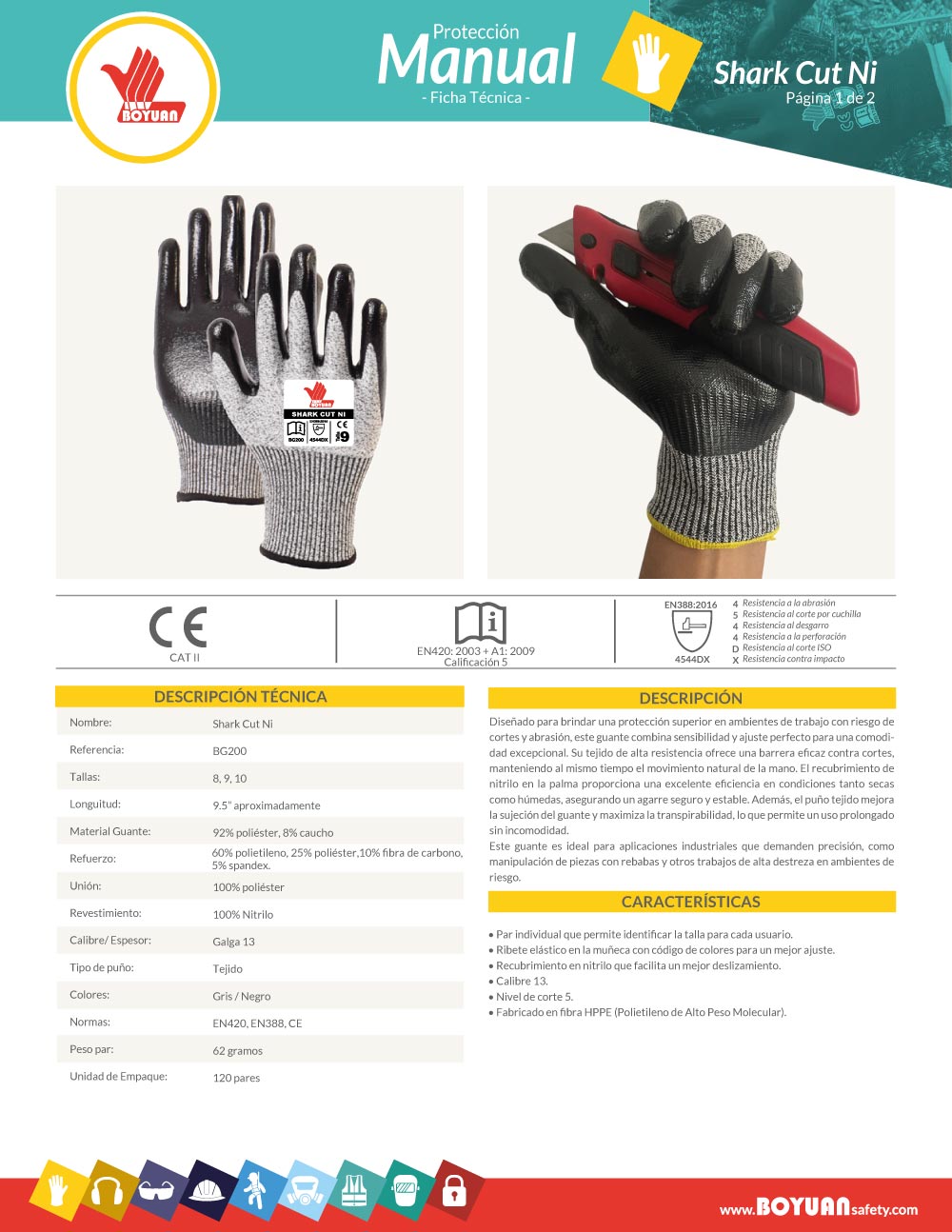 Guante anticorte nivel de corte 5, recubrimiento en Nitrilo BG200HPPE / 92% Poliéster / 8%Caucho / 60% Polietileno / 25%Poliéster / 10% Fibra de carbono/ Recubrimiento 100% nitrilo8 - 9 - 10 10.5".Aproximadamente EN 388 4543 Fibra HPPE (Polietileno de Alto PesoMolecular).Nivel de corte 5 Calibre 13 Recubrimiento en nitrilo que permite mejordeslizamiento del guante sobre equipos y materiales.Ribete elástico en la muñeca con código decolores que permite identificar la talla paracada usuario.