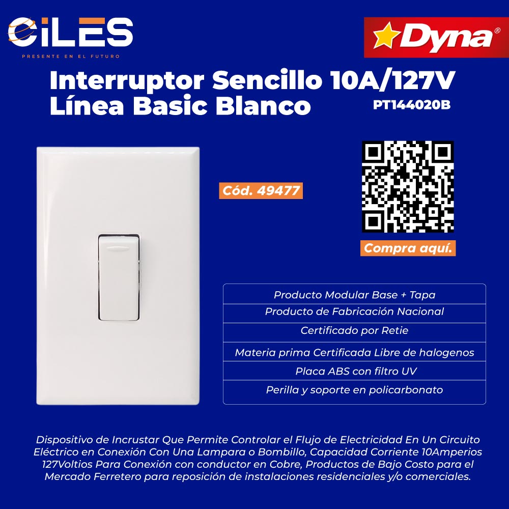 Interruptor Sencillo 10Amp/127V Linea Basic Blanco, Producto Modular Base + Tapa , Dispositivo de Incrustar Que Permite Controlar el Flujo de Electricidad En Un Circuito Eléctrico en Conexion Con Una Lampara o Bombillo, Producto de Fabricacion Nacional, Certificado por Retie, Materia prima Certificada Libre de halogenos, Perilla y soporte en policarbonato, Placa ABS con filtro UV, Capacidad Corriente 10Amperios 127Voltios Para Conexión con conductor en Cobre, Productos de Bajo Costo para el Mercado Ferretero para reposición de instalaciones residenciales y/o comerciales.