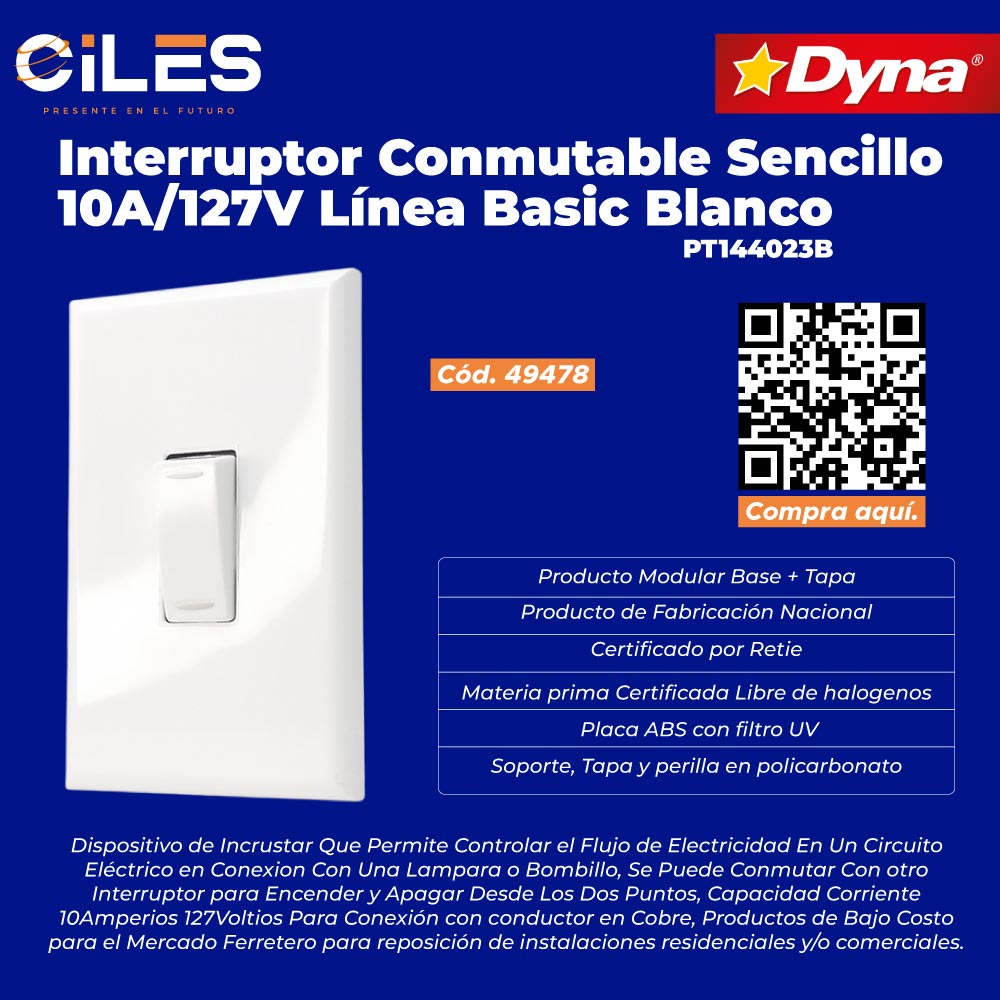 Interruptor Conmutable Sencillo 10Amp/127V Linea Basic Blanco, Producto Modular Base + Tapa , Dispositivo de Incrustar Que Permite Controlar el Flujo de Electricidad En Un Circuito Eléctrico en Conexion Con Una Lampara o Bombillo, Se Puede Conmutar Con otro Interruptor para Encender y Apagar Desde Los Dos Puntos, Producto de Fabricacion Nacional, Certificado por Retie, Materia prima Certificada Libre de halogenos, Soporte, Tapa, y perilla en policarbonato, Placa ABS con filtro UV, Capacidad Corriente 10Amperios 127Voltios Para Conexión con conductor en Cobre, Productos de Bajo Costo para el Mercado Ferretero para reposición de instalaciones residenciales y/o comerciales.