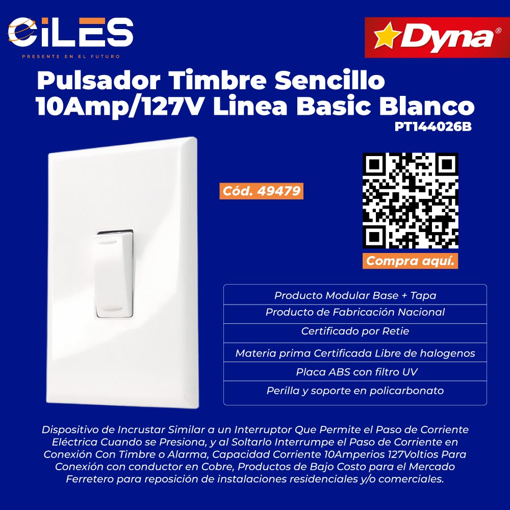 Pulsador Timbre Sencillo 10Amp/127V Linea Basic Blanco, Producto Modular Base + Tapa , Dispositivo de Incrustar Similar a un Interruptor Que Permite el Paso de Corriente Eléctrica Cuando se Presiona, y al Soltarlo Interrumpe el Paso de Corriente en Conexion Con Timbre o Alarma, Producto de Fabricacion Nacional, Certificado por Retie, Materia prima Certificada Libre de halogenos, Soporte, Tapa, y perilla en policarbonato, Placa ABS con filtro UV, Capacidad Corriente 10Amperios 127Voltios Para Conexión con conductor en Cobre, Productos de Bajo Costo para el Mercado Ferretero para reposición de instalaciones residenciales y/o comerciales.