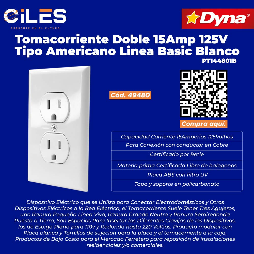 Tomacte Doble 15Amp 125V Tipo Americano Linea Basic Blanco, Dispositivo Eléctrico que se Utiliza para Conectar Electrodomésticos y Otros Dispositivos Eléctricos a la Red Eléctrica, el Tomacorriente Suele Tener Tres Agujeros, uno Ranura Pequeña Línea Viva, Ranura Grande Neutro y Ranura Semiredonda Puesta a Tierra, Son Espacios Para Insertar las Diferentes Clavijas de los Dispositivos, los de Espiga Plana para 110v y Redonda hasta 220 Voltios, Producto modular con Placa blanca y Tornillos de sujecion para la placa y el tomacorriente a la caja, Capacidad Corriente 15Amperios 125Voltios, Para Conexión con conductor en Cobre,Tapa y soporte en policarbonato, Placa ABS con filtro UV, Productos de