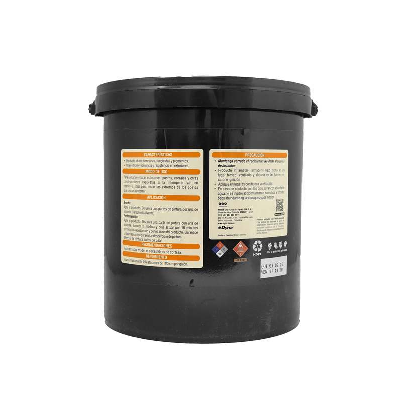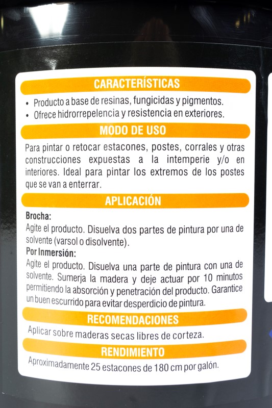 Producto impermeabilizante para retoque y pintura de estacones, postes, cercas, portones, talanqueras, corrales, entre otros. Ideal para extremos de postes que se van a enterrar. Máxima impermeabilización. Es pintura, no brea diluida. Secado rápido: Entre 15 y 20 minutos si es aplicado con brocha, 1 hora si se aplica por inmersión. Alto grado de cubrimiento. Rendimiento óptimo de 25 a 30 estacones por galón (sin diluir). Es un producto amigable con el medio ambiente. Soluble en varsol, thinner y gasolina. Preparación 1 en 1 (1 Porción de Pintura + 1 Porción de Solvente). Presentación de 1 galón . Referencia IMPDO10 de Pinte.
