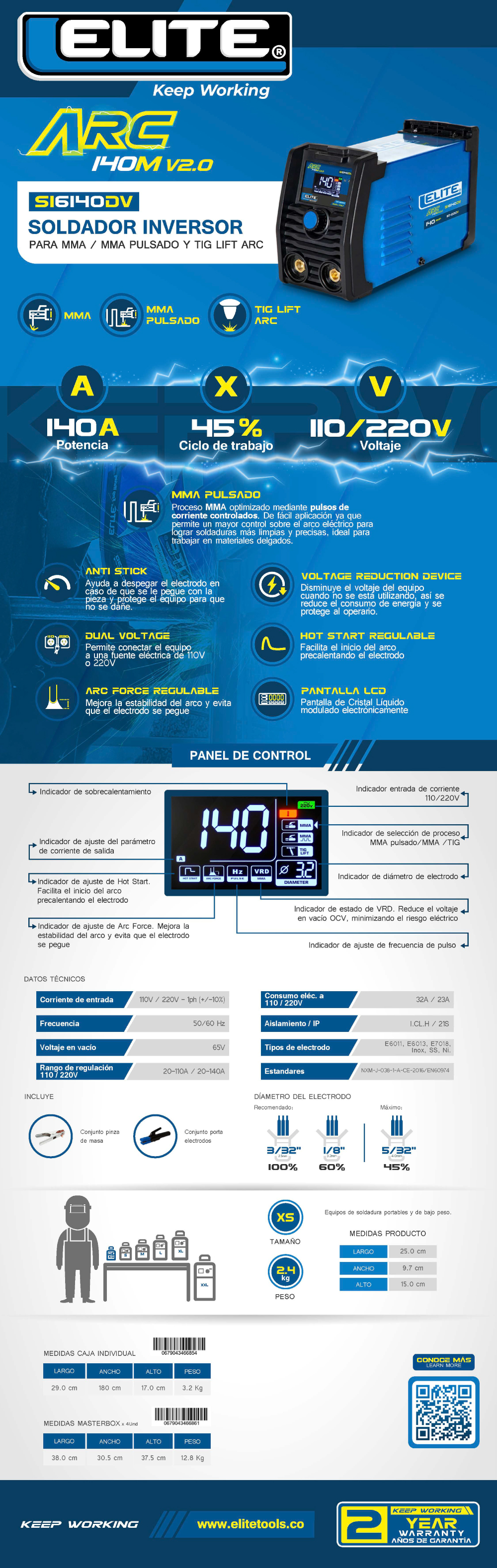 Soldador inversor bivoltaje portable, compacto y con pantalla LCD para MMA y TIG LiftArc. 10A-110A (110V) y 10A-140A (220V). Diámetro de electrodos 1/16"(1.6 mm) a 5/32"(4.0mm) en 6011 (Celulósico), 6013 (todos los Rutílicos), 7018, 7014, 7024 (todos los básicos), Inox SS, Fundición, Ni, entre otros. El ciclo de trabajo del electrodo 1/16"- 3/32" es 100%; de 1/8” es 60% y de 5/32" es 45% . Cuenta con tecnología VRD, AntiStick, ArcForce y HotStart regulable. Incluye: pinza masa y portaelectrodo con conexión 10/25. Peso 2,4 kg