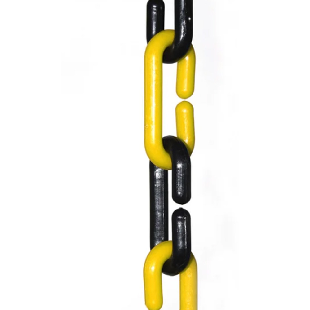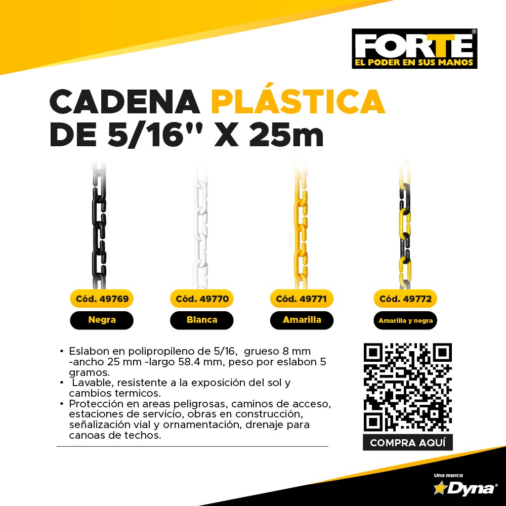 Fisica; Eslabon en polipropileno de 5/16, grueso 8 mm -ancho 25 mm -largo 58.4 mm, peso por eslabon 5 gramos, Lavable, resistente a la exposición del sol y cambios termicos. Uso: protección en areas peligrosas, caminos de acceso, estaciones de servicio, obras en construcción, señalización vial y ornamentación, drenaje para canoas de techos.