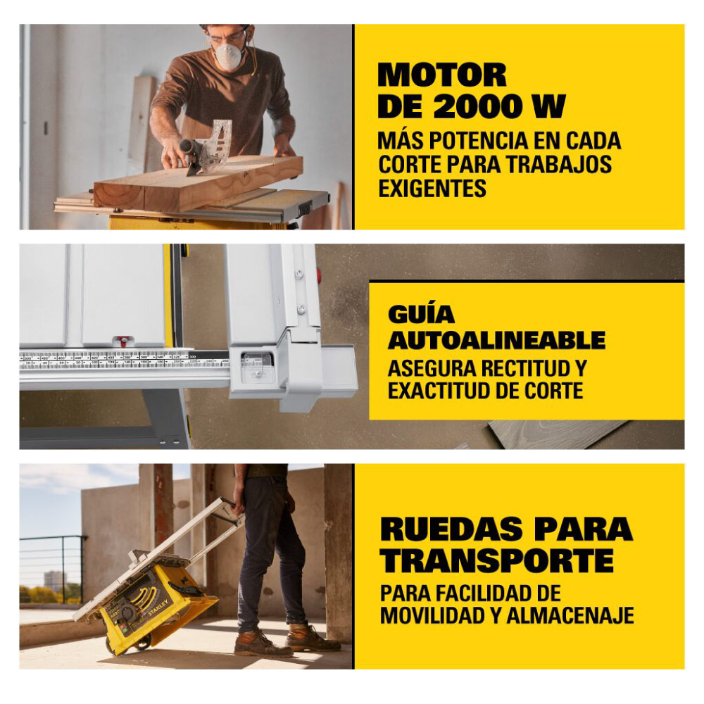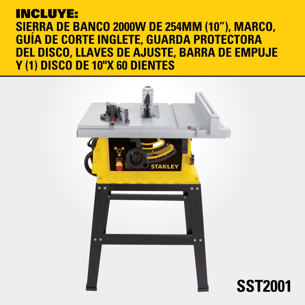 Sierra de mesa disco 10” con potente motor de 2000W (+11% que la SST1800) que otorga mayor capacidad frente a trabajos repetitivos y exigentes. Mesa de aluminio de alta durabilidad extensible sin herramientas ofreciendo mayor rango de corte para elementos de gran tamaño. Guía autoalineable que garantiza precisión en los cortes y lectura inteligente en 2 escalas. Marco/base sólida para mayor estabilidad y rigidez y ruedas para transporte y almacenamiento. Ranuras para guías de corte inglete. 2 puertos de recolección de polvo para mayor seguridad del operario. Incluye disco