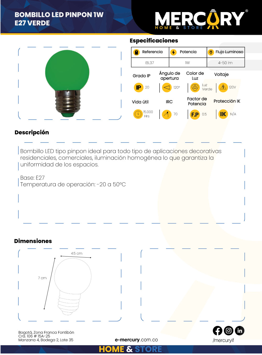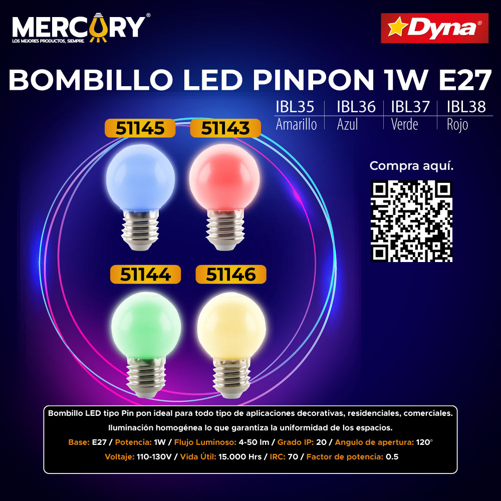 Bombillo LED tipo pinpon ideal para todo tipo de aplicaciones decorativas residenciales, comerciales, iluminación homogénea lo que garantiza la uniformidad de los espacios. Base: E27. Temperatura de operación: -20 a 50°C