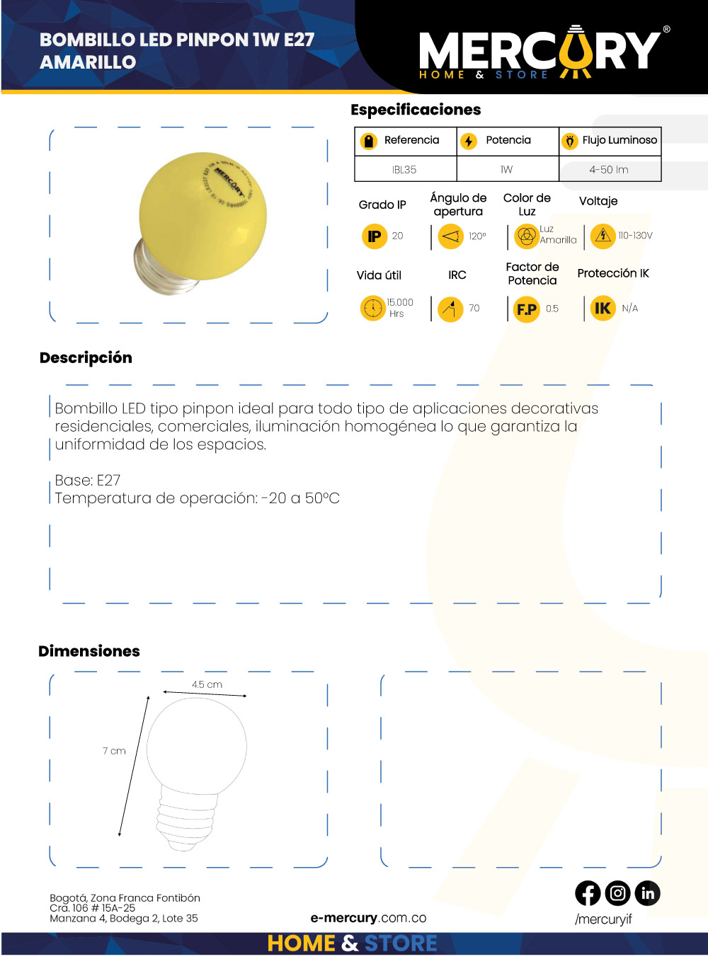 Bombillo LED tipo pinpon ideal para todo tipo de aplicaciones decorativas residenciales, comerciales, iluminación homogénea lo que garantiza la uniformidad de los espacios. Base: E27. Temperatura de operación: -20 a 50°C