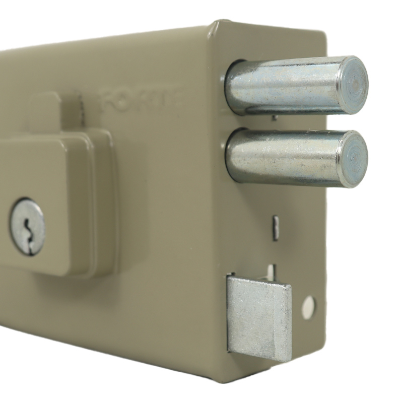 Cerradura de sobreponer con dos pasadores en acero calibrado Ø 12 mm. Caja y cantonera en acero Cold Rolled cal. 18 (1,2 mm) con mecanismo interno en calibres 14 (1,9 mm), 16 (1,5 - 1,6 mm) y 18 (1,2 mm). Cilindro exterior de 5 pines con pines codificados y porta cilindros en zamak. Acabado en pintura electrostática de alta resistencia. Para puertas metálicas y de madera de 35 mm de espesor. Cierre de seguridad con 3 vueltas de giro. Apertura exterior con llave; interior con manija para el picaporte y llave para los pasadores.