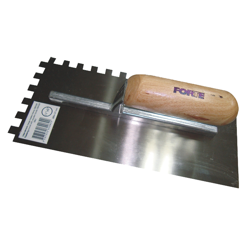 Fabricado en acero al carbono, mayor durabilidad y resistencia. Para trabajos de albañilería principalmente, para extender o aislar revoques, tanto en pisos como paredes. Dentada para pegado de pisos y enchapes, paso pequeño. Mango madera. Medida 11pg x 5pg, Diente de 3/8pg x 3/8pg.