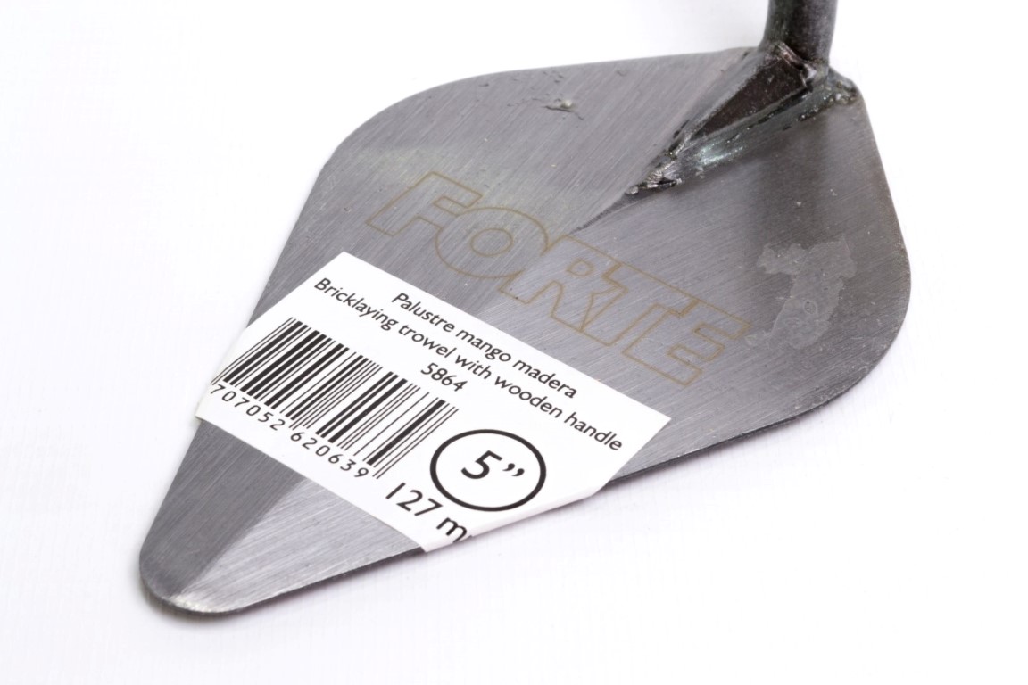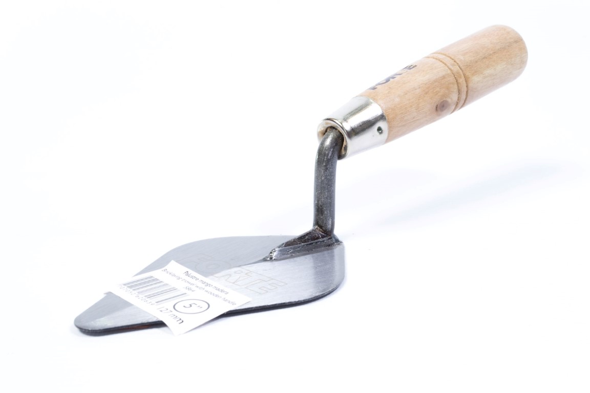 Cuerpo en Acero al Carbono, templado. Mayor durabilidad y resistencia. Mango soldado. Soldadura verificada con rayos X. Útil para trabajos de albañilería principalmente, para mezclar, recoger, transportar y extender masillas, revoques y pinturas. Mango Madera.