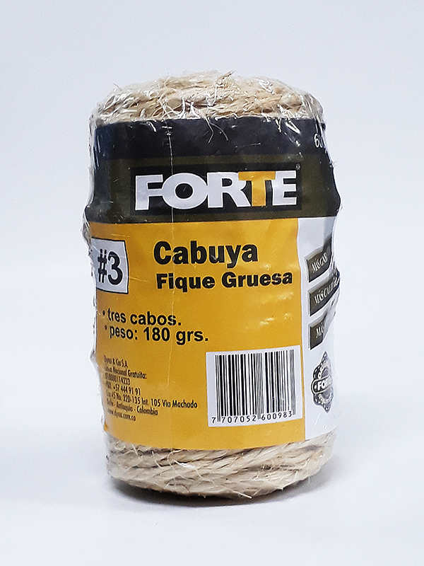 Fique (fibra vegetal) Biodegradable 100%, color natural, resistencia mínima a la tensión 59 Kgf, 31 metros, 180 gramos. Estructura 3 cabos.