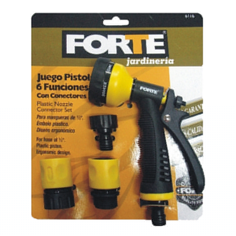 Fabricada en Nylon y TPR (caucho), recubrimiento Softrip (Agarre suave), diseño ergonómico. Incluye: conectores rápidos para mayor eficiencia. Embolo plástico. 6 funciones de aspersión: cortina de agua, llovizna, chorro precisión, abanico, roció y chorro lento.
