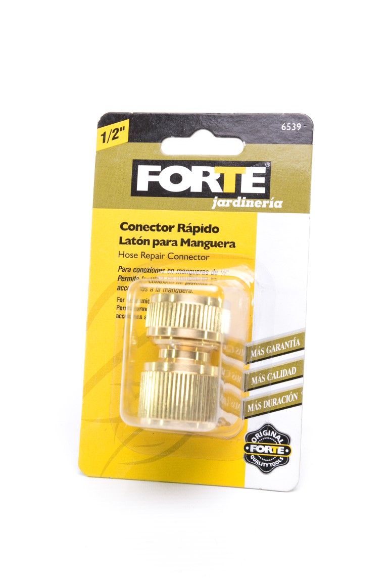 Fabricado en latón. Alta resistencia y durabilidad, resistente a la intemperie, puede ser usado con agua caliente. Usado en mangueras de 1/2pg. Proporciona una conexión fácil y rápida entre la manguera y la llave, pistola u otros accesorios. Útil en el riego de jardines y limpieza de automóviles o animales. Empaque tarjeta y blíster. Nota: Los conectores rápidos requieren el uso de los adaptadores 6540 y 6122.