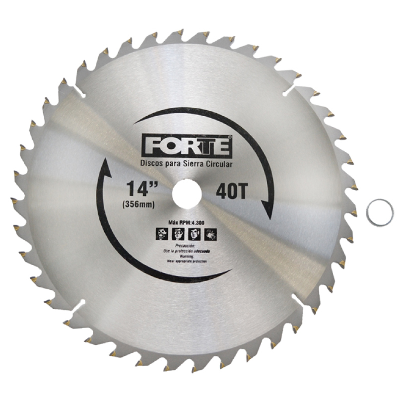 Cuerpo fabricado en acero al carbono para mayor resistencia. Diente con pastilla de tungsteno para mayor dureza y rendimiento en el corte. Pastilla de tungsteno soldada por láser que evita el desprendimiento en el momento de operación. Se utiliza para corte de madera. Diámetro 14pg, # de dientes 40, Eje 30 mm * con bujes 1pg (25 mm) y 5/8pg (16 mm). Empaque blíster individual con bujes incluidos.