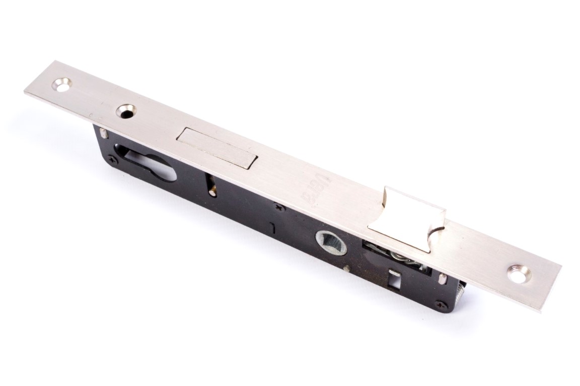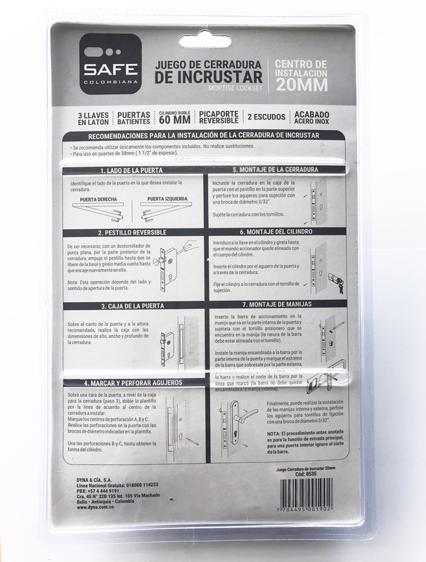 Cerradura de incrustar con picaporte reversible y macho rectangular, ideal para puertas batientes. Fabricada en lámina cold rolled, latón y zamak, con un acabado en Acero Inox y pintura electrostática para mayor durabilidad. Cuenta con un cilindro tipo pera doble de 60 mm, distancia entre centros de 85 mm y centro de instalación de 20 mm. Incluye tres llaves niqueladas, escudos y recibidor para una instalación completa. Combina seguridad, funcionalidad y diseño moderno para adaptarse a diversos espacios.